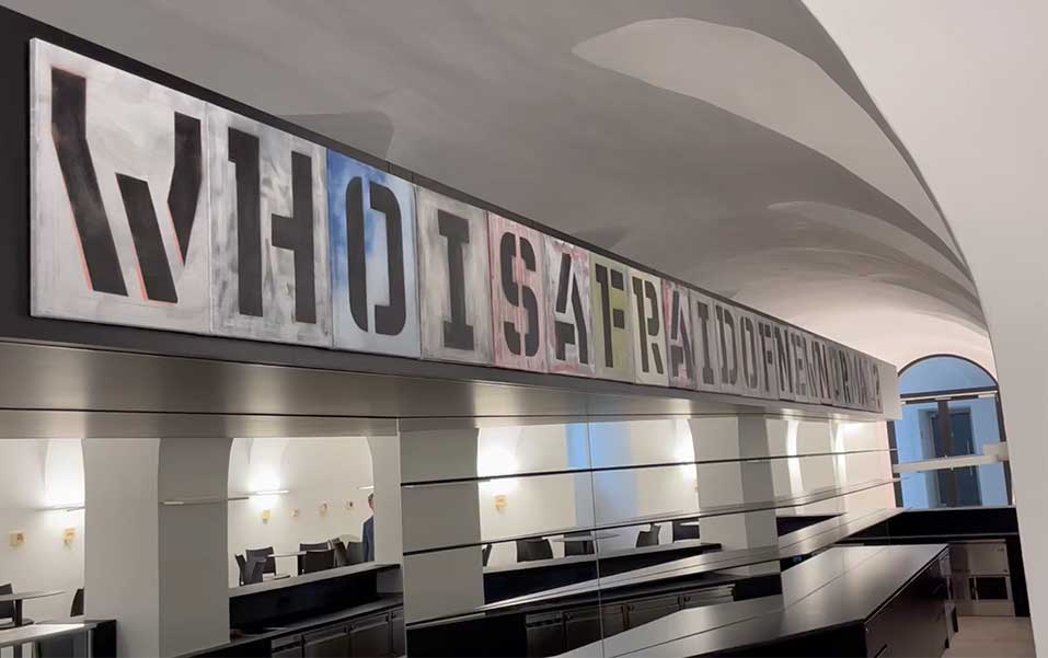 In der von Johannes Rauchenberger kuratierten Ausstellung bespielte ich die neu renovierten Teile des aus dem 17. Jh. stammenden historischen Minoritenklosters. Auf einem groß angelegten Ausstellungsparcours, der das Minoritenzentrum (Buffetbereich und Kl. Minoritensaal), das neue Stiegenhaus West und die Museumsräume im II. Stock umfasste, zeigte ich einige Klassiker der letzten Jahre, aber auch eine Reihe von erstmals zu sehenden Arbeiten, unter anderem ein neues Video, eine Neonarbeit, Spiegellettern und „Folienfenster“. Ganz besonders freue ich mich, dass ich auch eine ortsspezifische Wandinstallation anfertigen durfte.