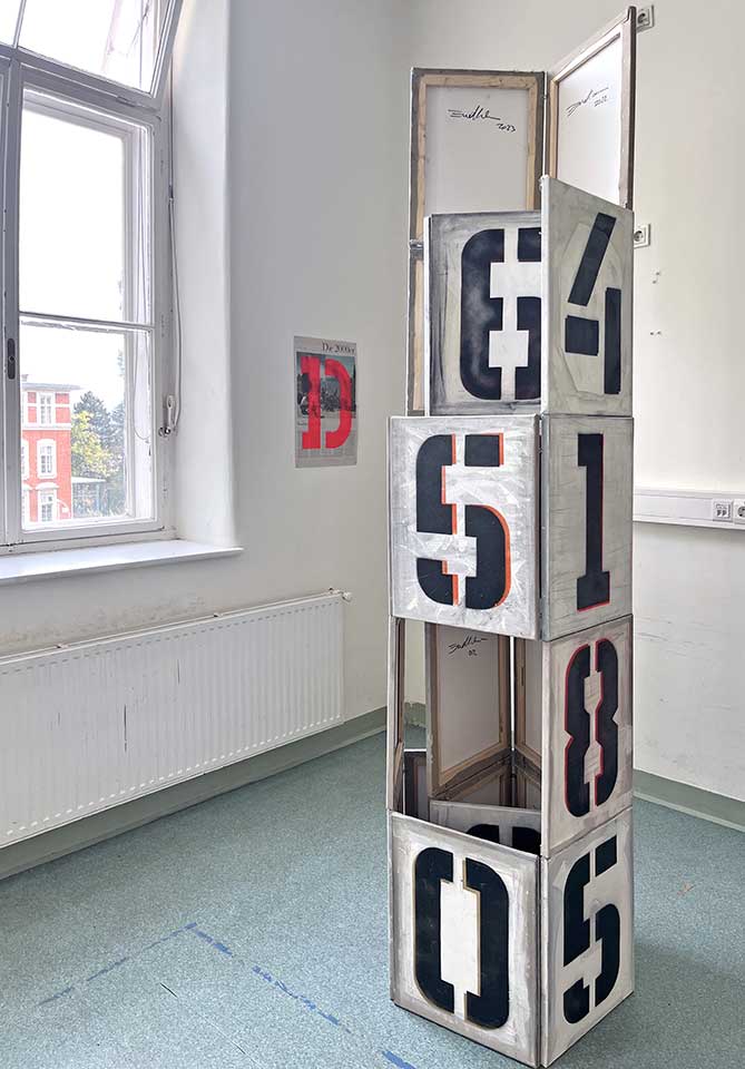 Bei dem Turm, der aus den Buchstabenbildern besteht, ist die Anordnung der Zeichen, also der Buchstaben, Ziffern und Satzzeichen zufällig, es gibt eine Variation von wenigen, zurückhaltenden Farben und eine Zeile aus Hugo Balls Dada Gedicht Karawane „GROSSIGA M’PFA HABLA HOREM“, die als Referenz an diese revolutionäre Kunstrichtung zu verstehen ist. Dieses vollkommen Neue, das die Anti-Kunst der Dadaisten ins Feld der Kunst einbrachte, die Skepsis gegenüber dem allgemeinen Kunstverständnis ist bei aller konzeptuellen Klarheit letztendlich auch ein Aspekt der Endlicher-Kunst.
