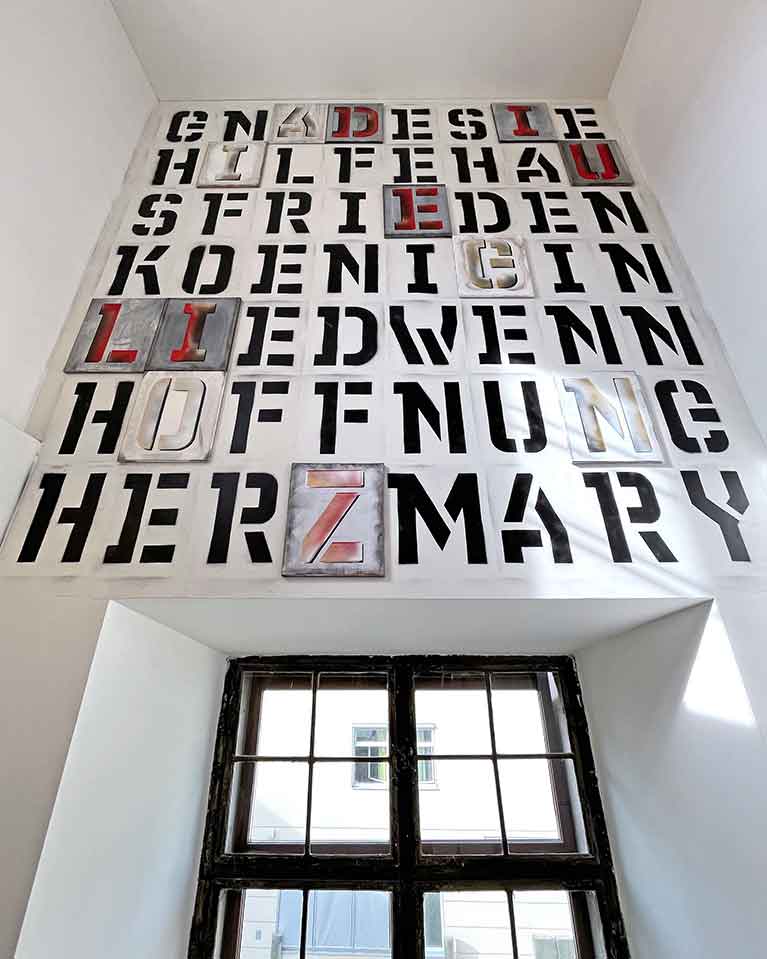 In der von Johannes Rauchenberger kuratierten Ausstellung bespielte ich die neu renovierten Teile des aus dem 17. Jh. stammenden historischen Minoritenklosters. Auf einem groß angelegten Ausstellungsparcours, der das Minoritenzentrum (Buffetbereich und Kl. Minoritensaal), das neue Stiegenhaus West und die Museumsräume im II. Stock umfasste, zeigte ich einige Klassiker der letzten Jahre, aber auch eine Reihe von erstmals zu sehenden Arbeiten, unter anderem ein neues Video, eine Neonarbeit, Spiegellettern und „Folienfenster“. Ganz besonders freue ich mich, dass ich auch eine ortsspezifische Wandinstallation anfertigen durfte.